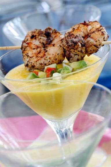 Mango Gazpacho with Spiced Shrimp Skewers