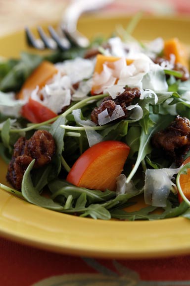 Winter Salad with Persimmons, Dates, Spiced Walnuts and Sherry Vinaigrette