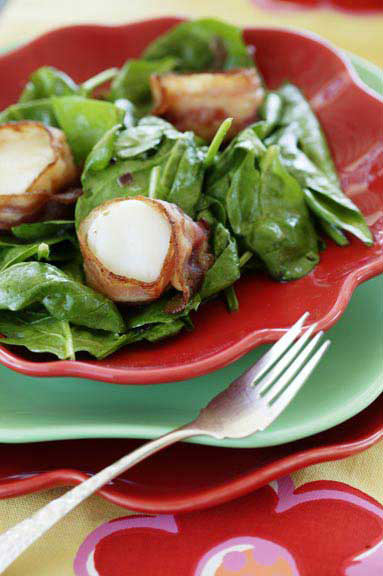 Spinach Salad with Bacon-Wrapped Scallops and Sweet Bacon Vinaigrette