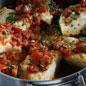 This casual menu is flavor packed and begins with Sfincioni, an anchovy and cheese topped Sicilian pizza. Marinated Eggplant serves as the antipasto. Simple Sicilian Cod is a quick and easy main dish, and it's accompanied by a warm potato salad that's dressed in extra virgin olive oil, capers and anchovies. Dessert is a not-too-sweet Ricotta Tart that is delicious served on its own or with a topping of sweetened fresh berries.