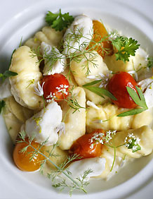 The five-course menu began with 3 versions of pork charcuterie, arranged on platters and casseroles in a family-style presentation, accompanied by the 2000 Pascal Cotat Sancerre les Monts Damnes. The fabulously rich and flavorful charcuterie, prepared from the restaurant’s own Berkshire pigs raised on the property, made interesting demands on the wine selection. To cut through the fat and refresh the palate, ample acidity was needed, but I was reluctant to create a severe contrast. So I chose the Cotat, a wonderfully aberrant sauvignon blanc from the Sancerre region in the Loire Valley, which provided the region’s trademark fresh minerality, but also possessed the non-traditional viscous core of peach and pear, a signature of this great vintner. It proved to be a delicious partner to the pork, but I would have liked a bit more zest on the finish. A big, yeasty, vintage Champagne would have been divine.