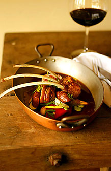 The main course, as if each could not have sufficed as such, was the roast duckling with a glaze of lavender honey. It had the soft glow of Armagnac and, surrounded by the stuffed miniature onions, eggplant, tomatoes and potatoes, presented a comforting visual effect that I was loath to disturb. I was waiting for Gene to burst into Le Marseilles. The aromas broke my concentration and set me forth into a panoply of rustic textures and flavors, paired with two very different wines to test the effectiveness of each with the duck. The ’99 Potel Volnay les Pitures was elegant, possessing a nose of red fruit and damp leaves, and a medium body with flavors of red cherries, iron, and soft earthiness. However, the broad, grand flavors of the honey-glazed duck somewhat suppressed the finer points of this wine, which, upon tasting, suggested it would have gone beautifully alongside the frog legs and their prominent mushroom sauce.