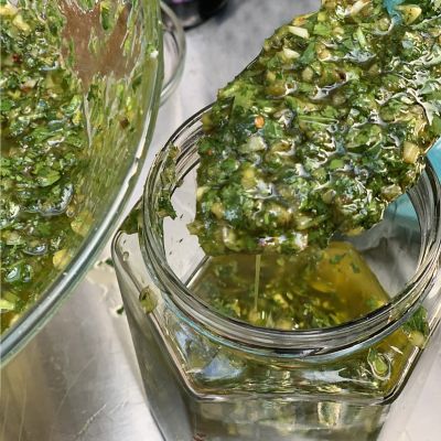 3/4 cup pine nuts 4 oz. Parmesan, grated (about 1 cup) 3 garlic cloves, chopped Pinch of chili flake 1 lemon, zested 8 cups basil leaves 1 cup of Olive Oil 1.5 tsp. kosher salt