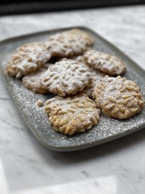 Chef Jackie's Pignoli Nut CookiesPignoli Nut Cookies Ingredients Directions To the bowl of a food processor, add almond paste and 1/2 cup pignoli nuts. Pulse until combined. Add sugars, egg whites, vanilla paste, almond flour and salt. Process until blended and smooth. Place remaining pignoli nuts into bowl. Scoop about 1 teaspoon size dough, roll into ball, and roll in pignoli nuts. Place onto prepared sheet trays, spacing cookies about 1" apart. Continue until all dough is used. Bake for 12-14 minutes until cookies are golden brown. Remove from oven, let cool. Once cooled, sprinkle with more powered sugar. |